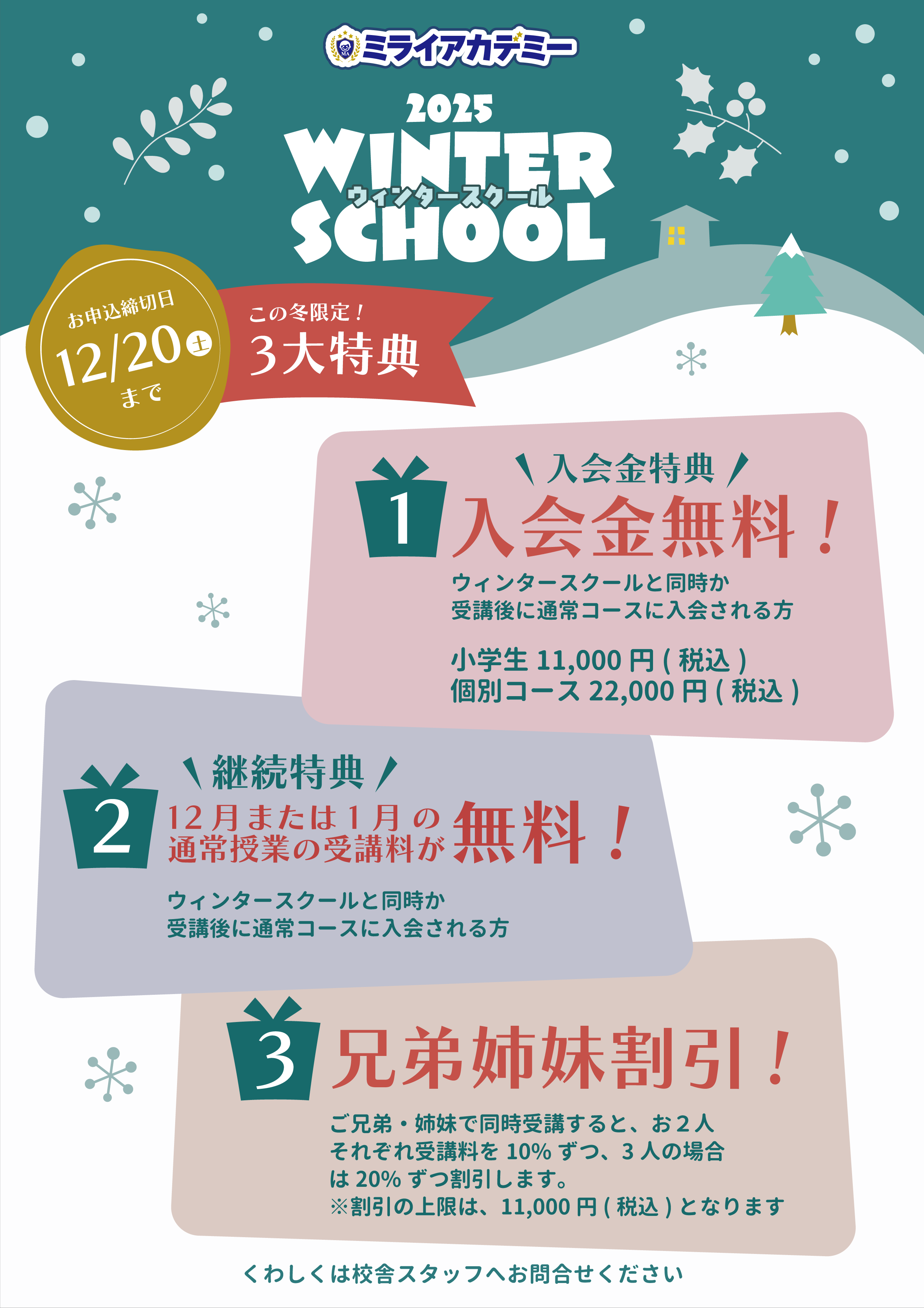 ☆入会特典:ウィンタースクール各種講座をお申込み・ご受講いただいた上、通常コースにご入会される方