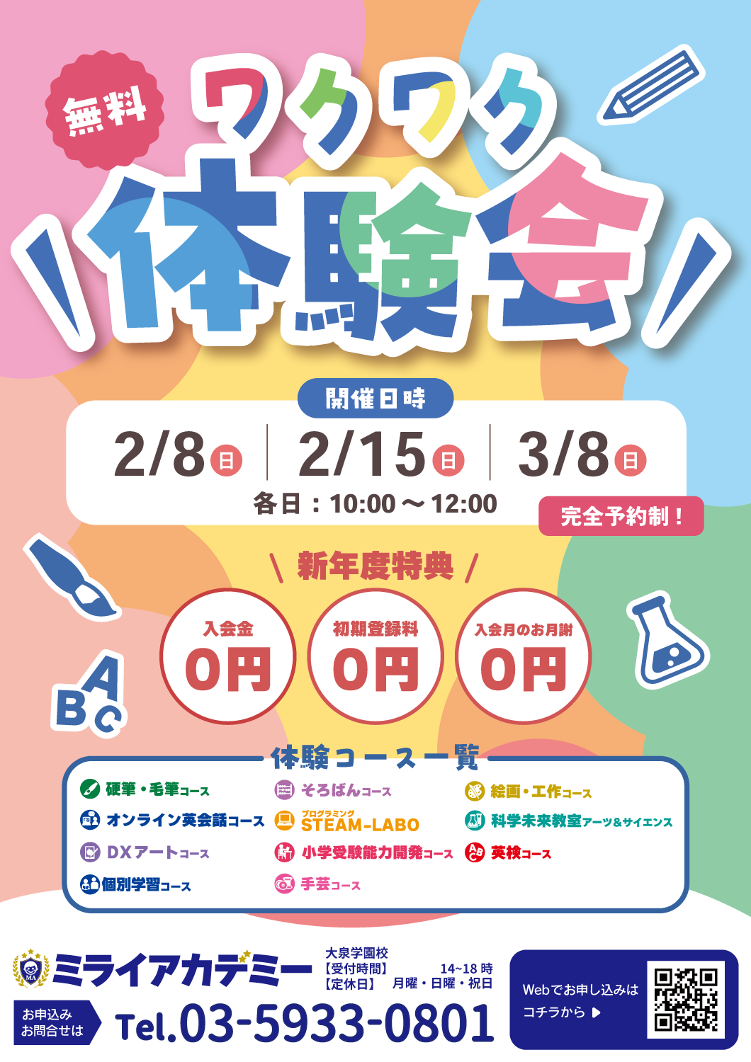 ミライアカデミーでは、英会話やそろばん、書き方といったお勉強に役立つコースから絵画・工作、科学実験など、多種多様なコースをご用意しております。